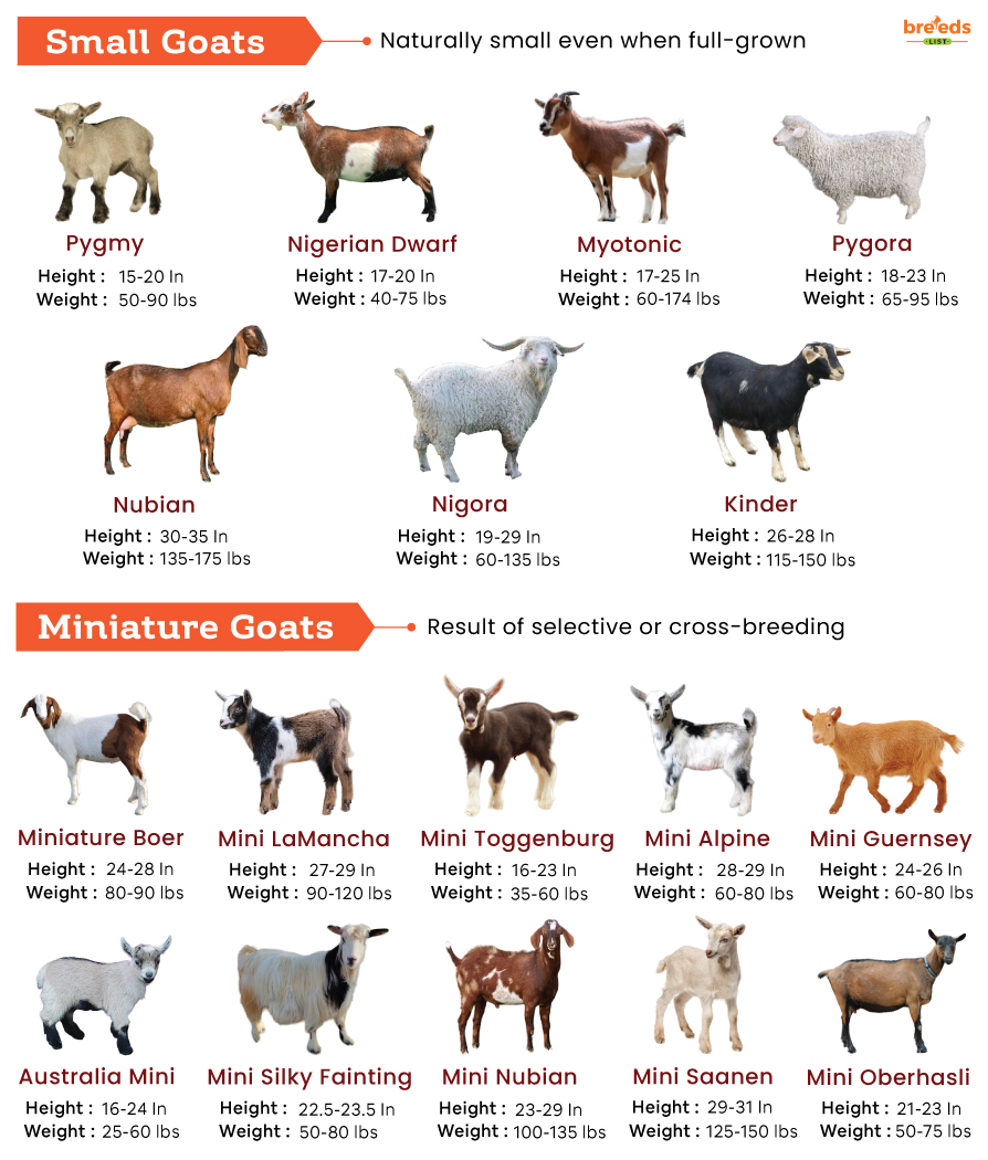 Crossbreeding and selective breeding are common among goat breeders, who experiment and create miniature versions of various breeds. The list below contains well-known examples arranged according to their height.